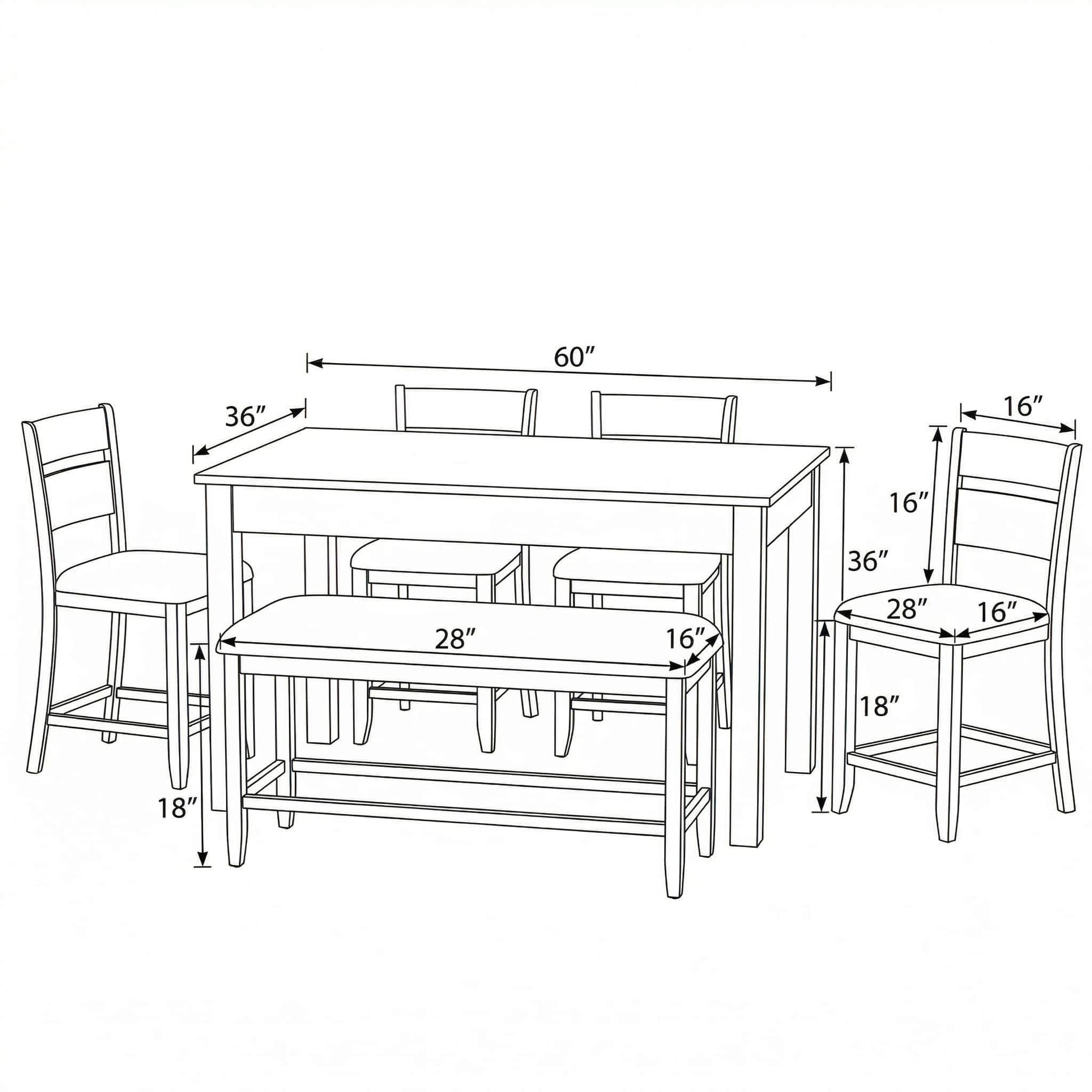 6 Piece Dining Set With Table, Chairs And Bench - Brown