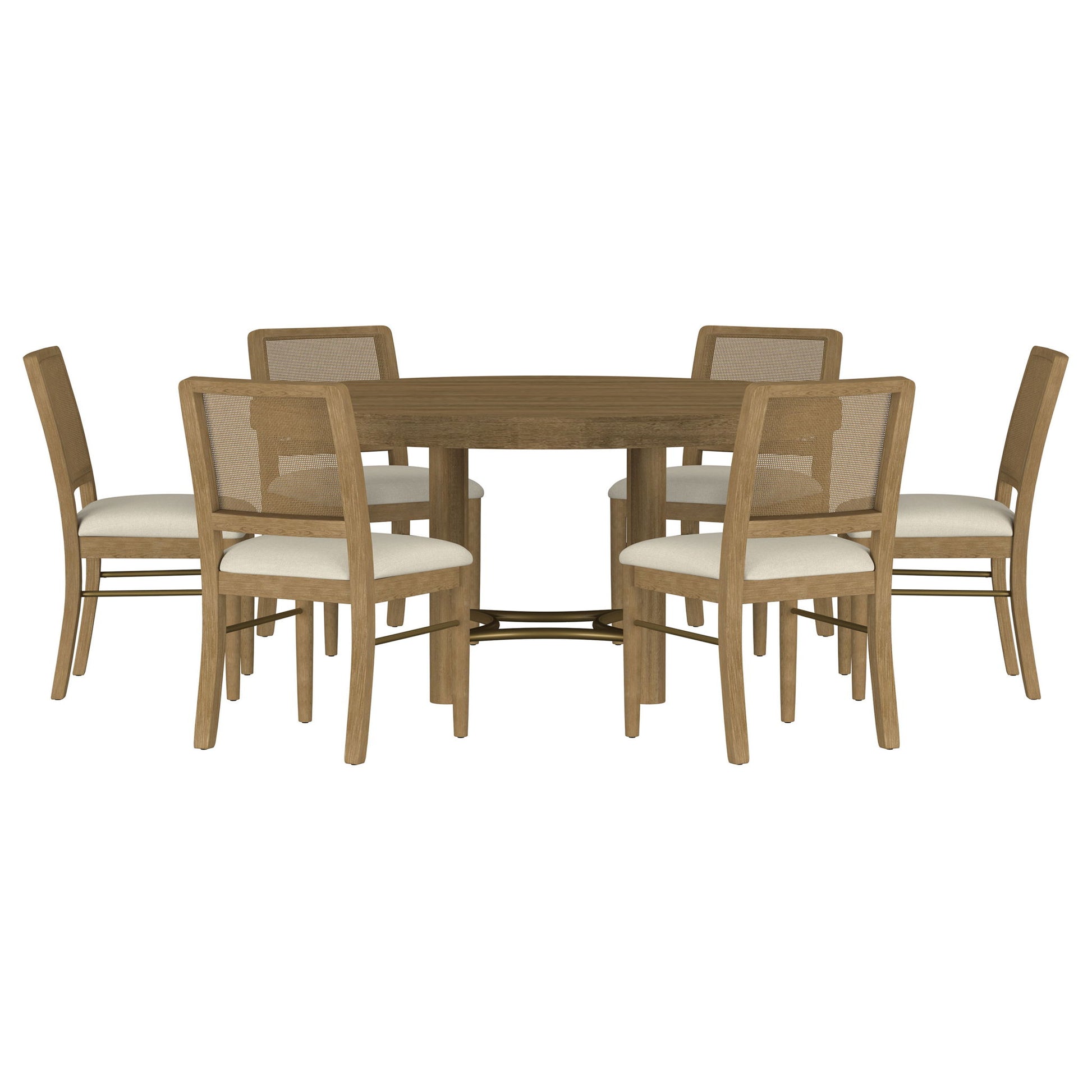 Rustic elegance and tailored design unite in this striking dining set, blending relaxed materials with refined structure. The round table features a sand wash finish over a smooth white ash veneer top, supported by clean cylindrical legs and an arched aged brass stretcher. Coordinating side chairs add contrast with handwoven rattan backs, soft upholstered seats, and sleek metal stretchers. Built from solid rubberwood, engineered wood, and natural textures, this set brings everyday comfort to modern rustic dining.