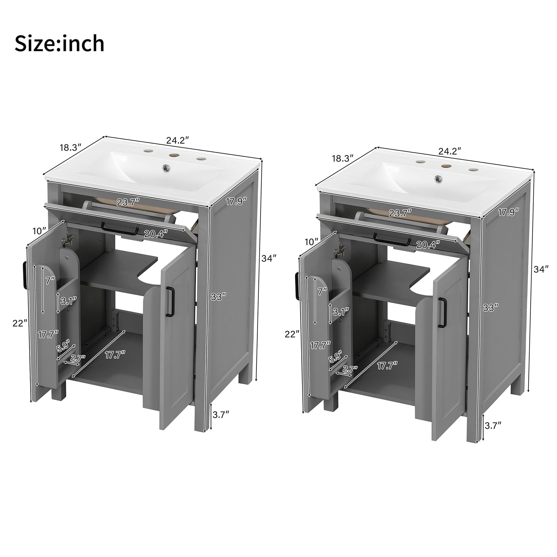 Bathroom Vanity With Sink, Soft Close Doors, Flip Drawer, Double Layer Door Shelves - Grey