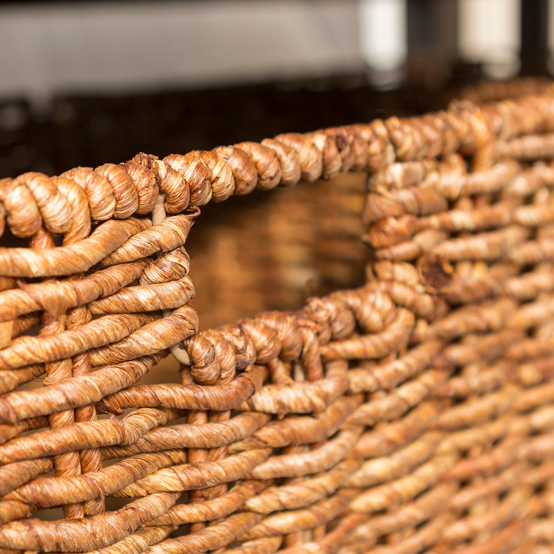- Includes two wicker baskets for storage