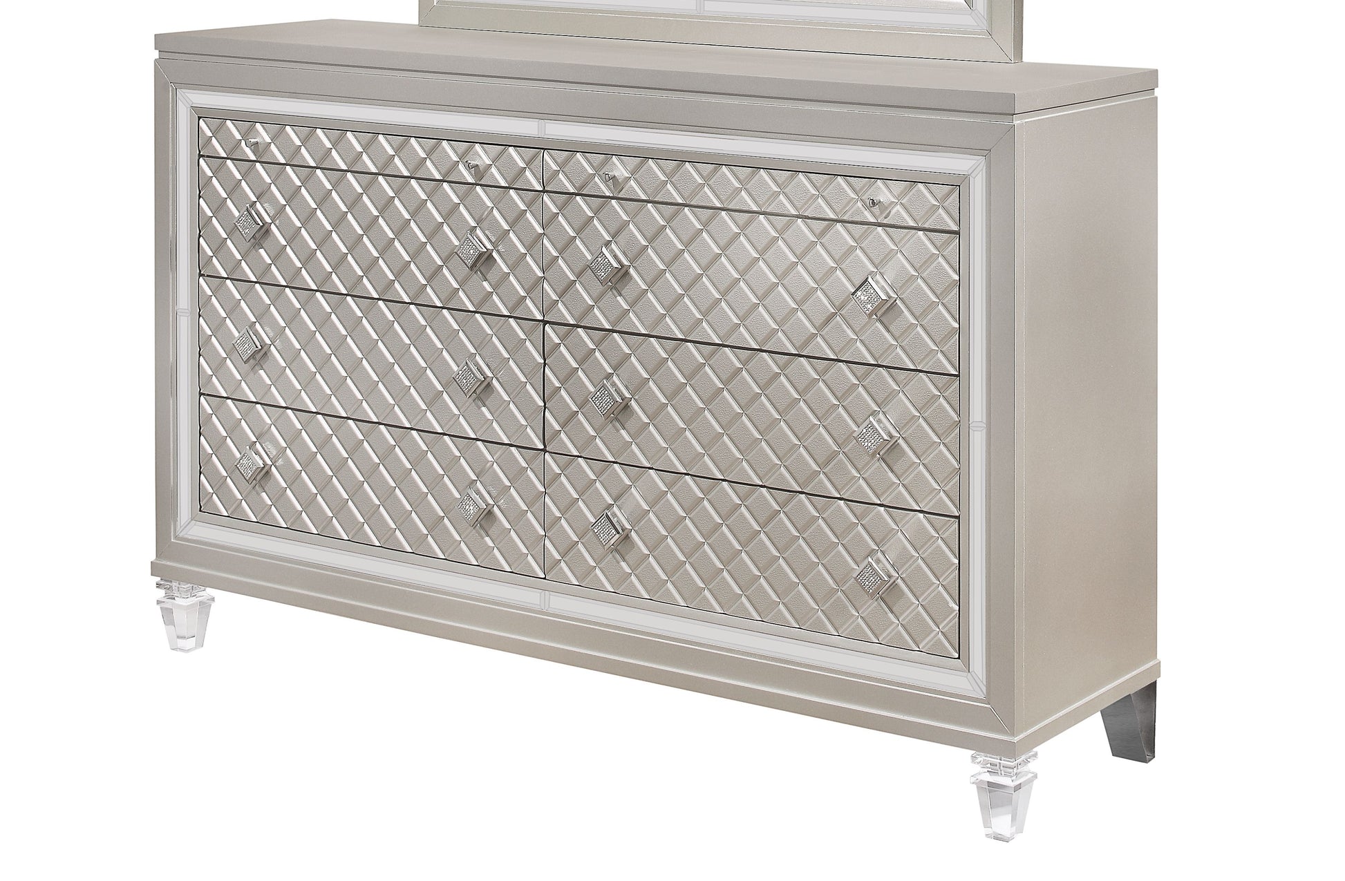 - Elegant Design: The CROSS GLAM CHAMPAGNE DRESSER features a sophisticated design with acrylic front legs and jewel embellished hardware, adding a touch of glamour to any bedroom decor.