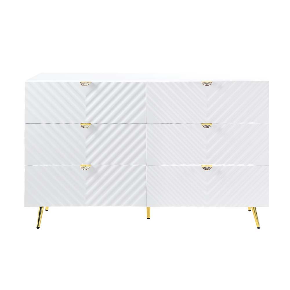 The Gaines Collection is a glamorous and sophisticated grouping that adds a chic style to any room. The white gloss finish and gold metal accents help to accentuate the clean lines of the pieces and add a pop of glamour. The diagonal line design adds visual interest and texture, making each piece stylish. With a variety of storage options to meet your needs.