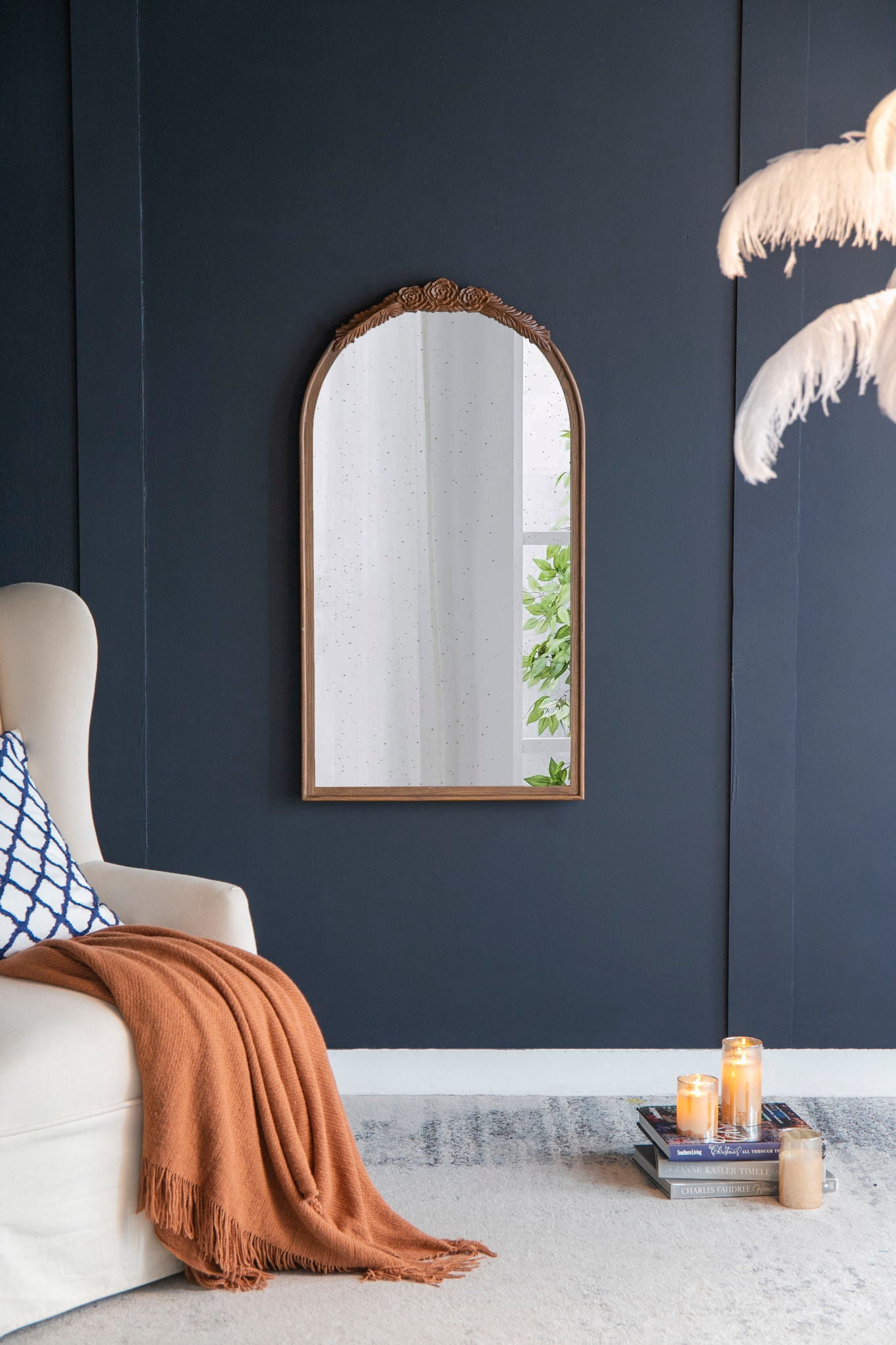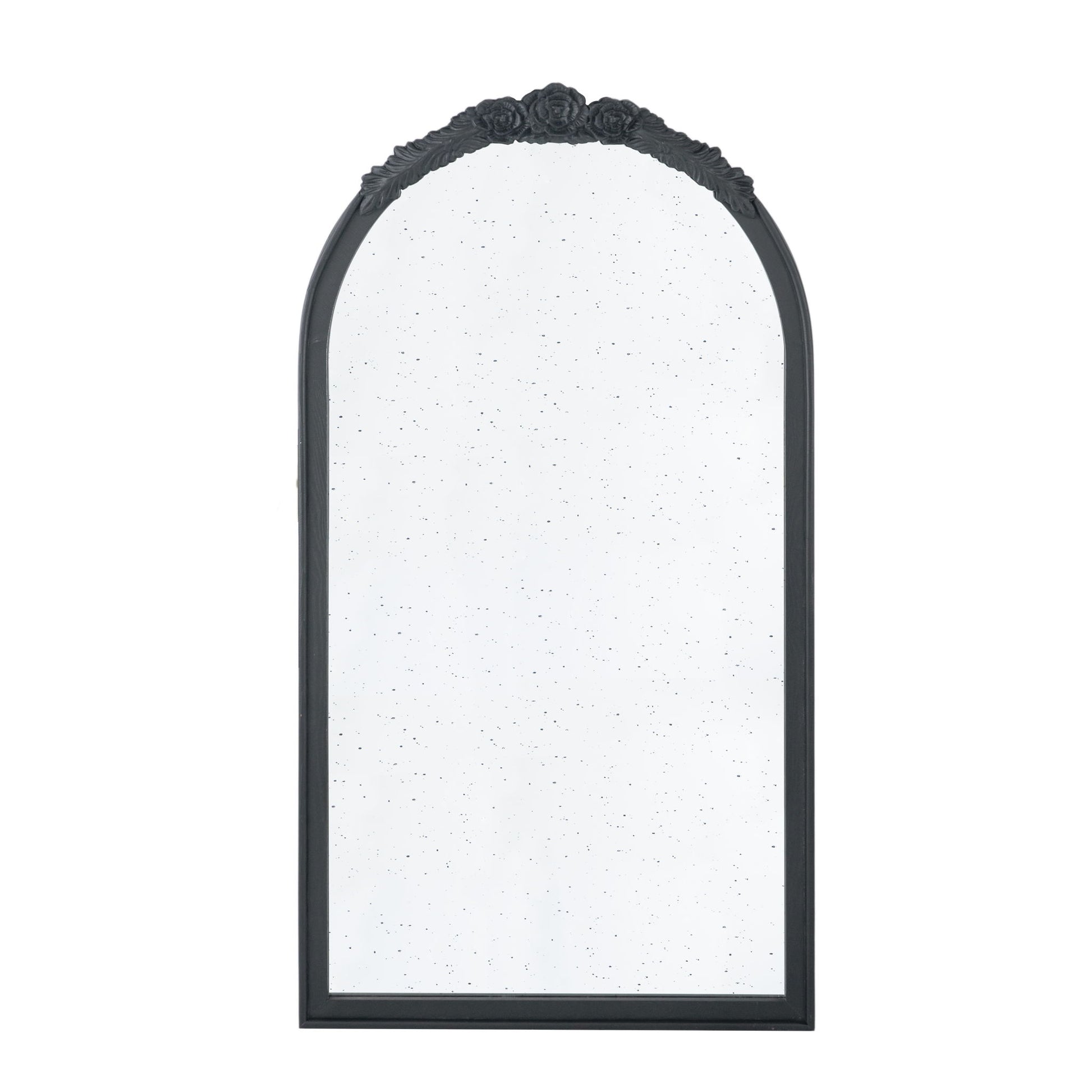 Hand Carved Rose Antique Mirror Frame, Large Arch Mirror Wall Decor For Living Room, Bathroom, Entryway - Black