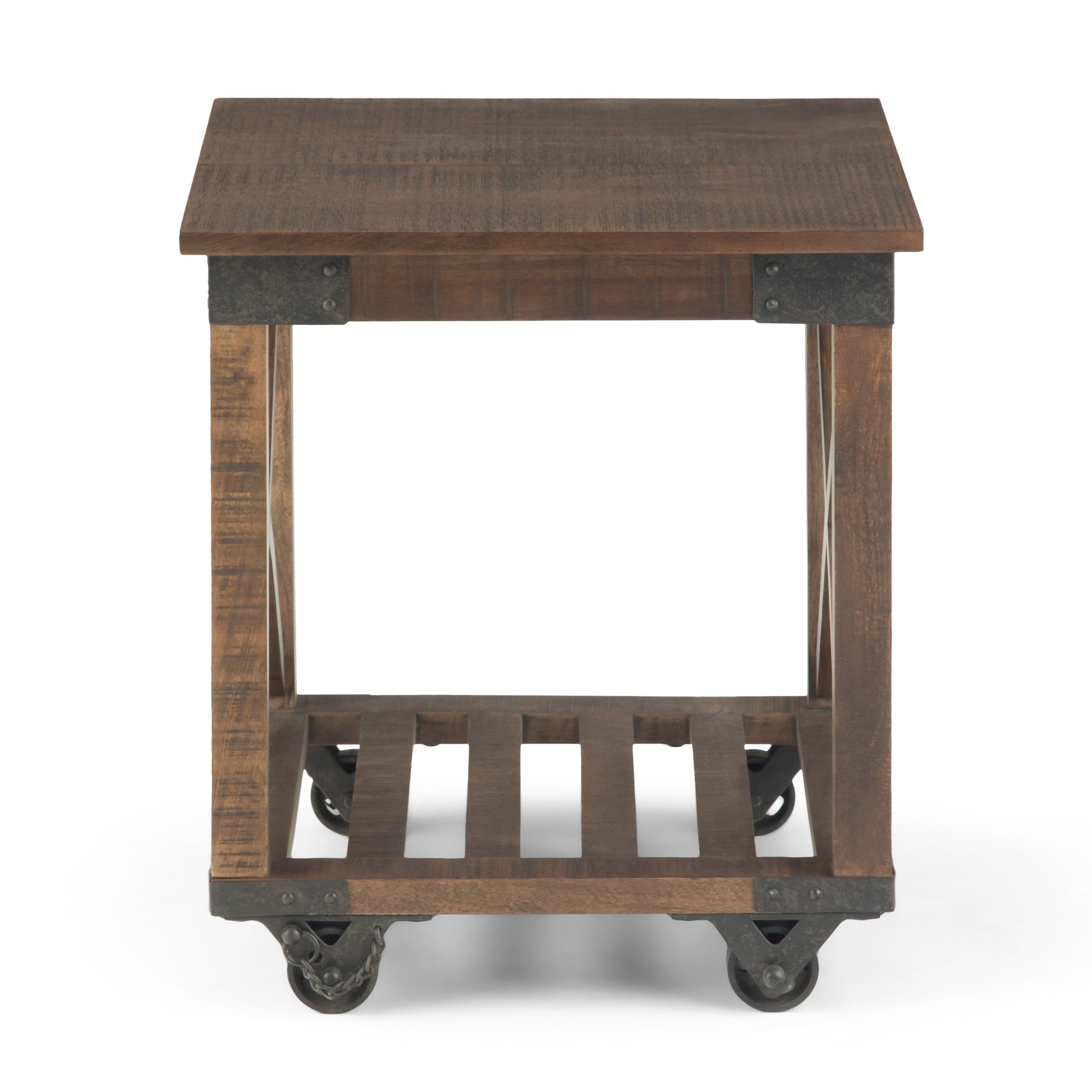 - Features spacious table top, slatted open bottom shelf, X detail on sides, unique iron wheels that offer mobility and can be easily locked into place
