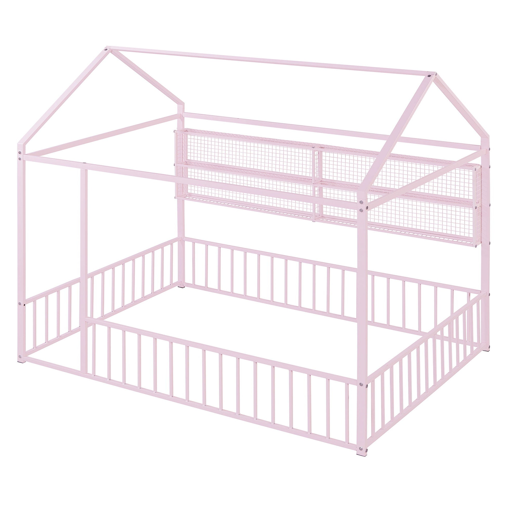 Full Size Bed House Frame With Fence And Shelves - Pink