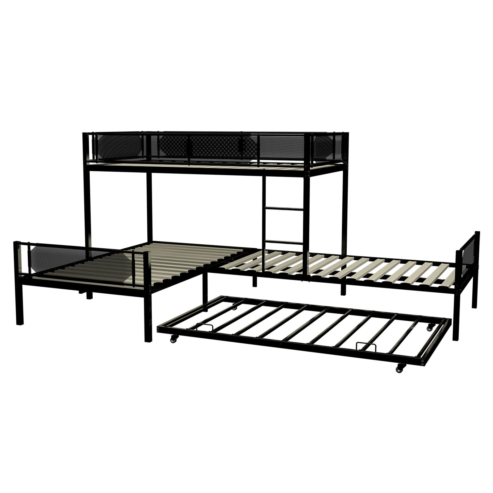 L Shape Metal Triple Bunk Bed With Trundle For 4 Kids, Heavy Duty Metal & Wood Construction - Black
