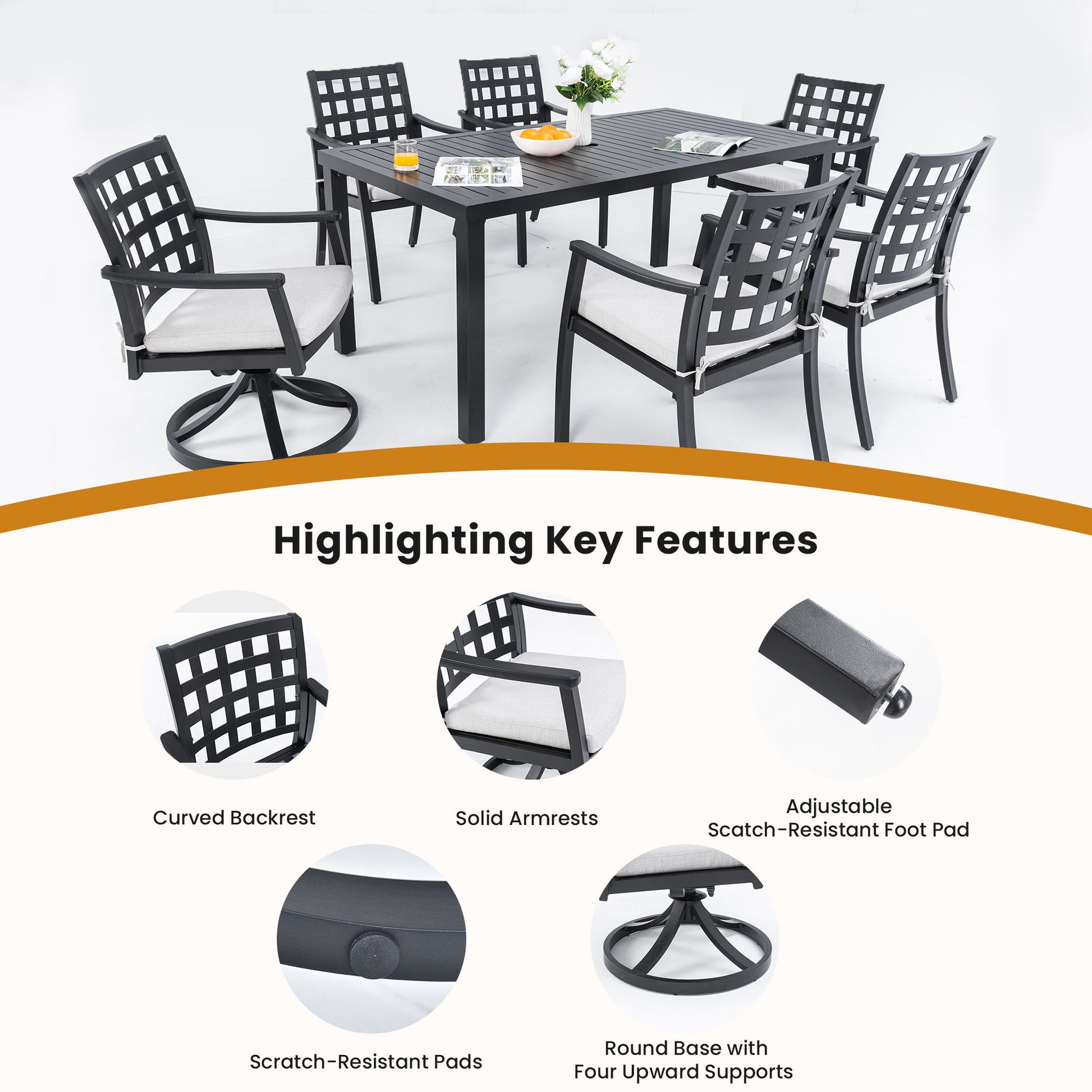 7 Pieces Modern Classic Outdoor Patio Dining Set, Rectangular Table & 6 Swivel Rock Dining Chairs, Rust Free, Weather Resistant - Ember Black