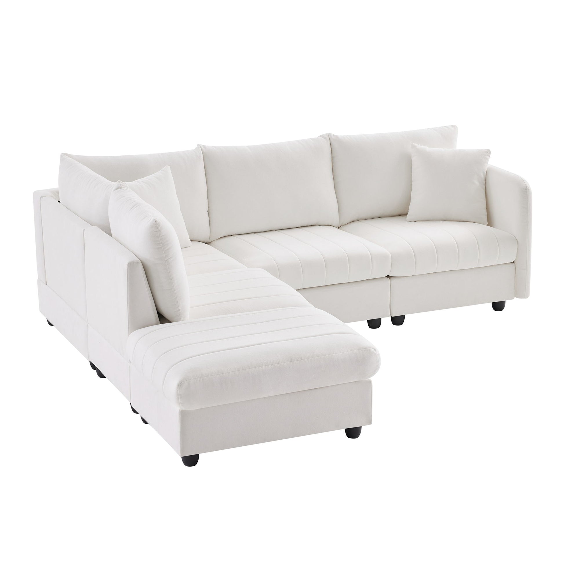 Modern Sectional Sofa With Vertical Stripes, 2 Pillows, 5 Seat Couch With Convertible Ottoman, Various Combinations, L-Shape Indoor Furniture - White