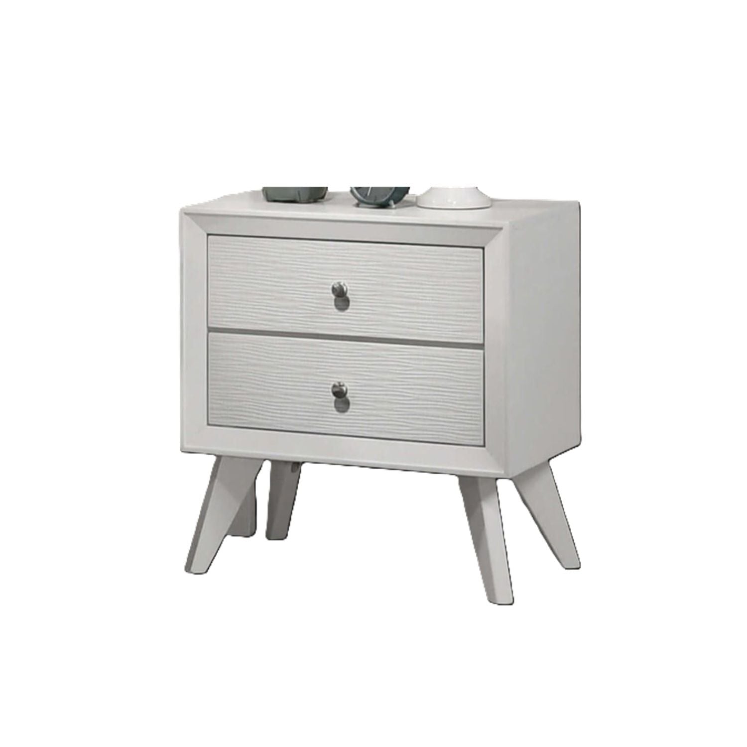 Nightstand With Angled Legs, Round Knobs, Wave Texture, 2 Drawer Bedside Table - White
