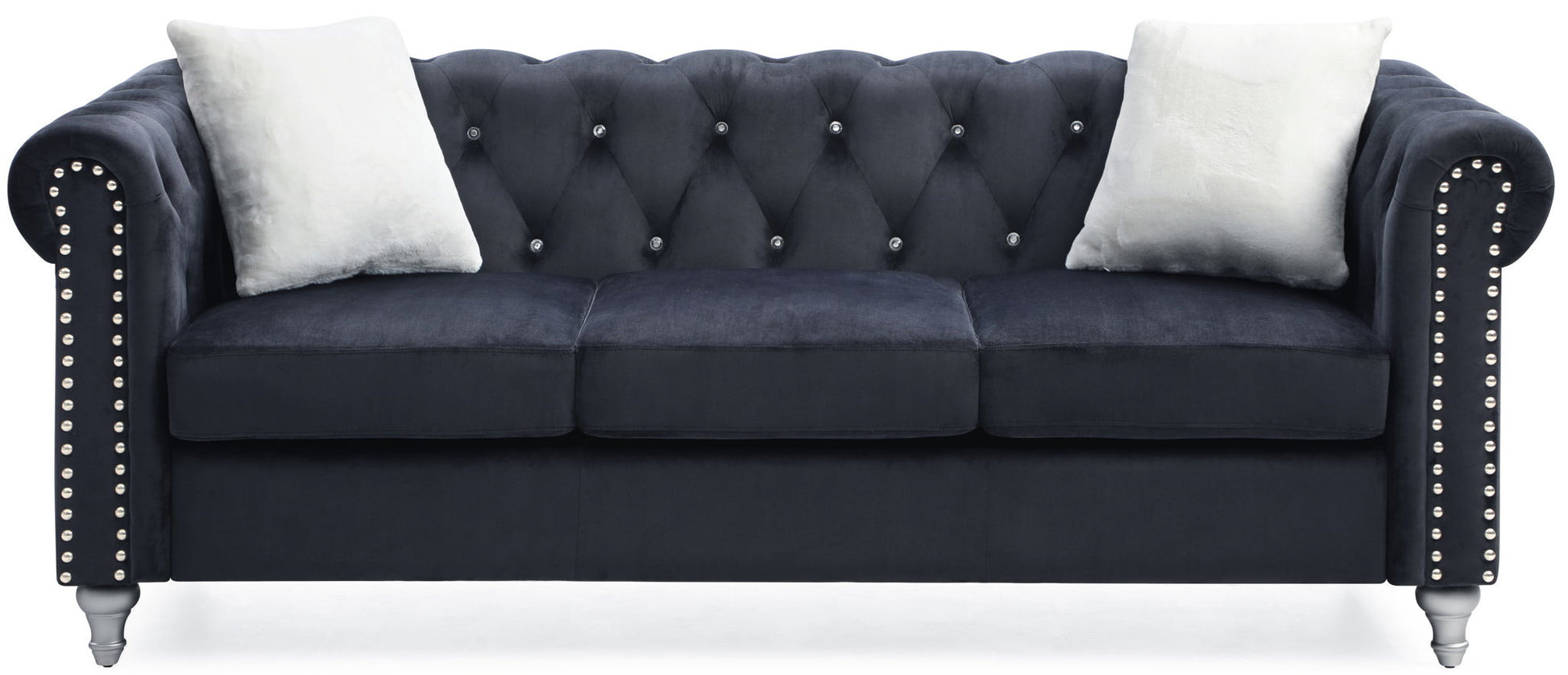 - Handcrafted Nailhead Accents: Hand applied nailheads provide a striking contrast to the rich velvet micro suede cover, adding elegance to the sofa.