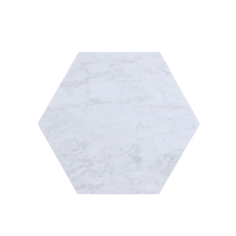 Redefine your space with a modern look and industrial styling with the Reon End Table. This hexagon shaped end table features a magnificent marble top resting on a sturdy open wood base, showcasing a distinctive style for an intriguing look. This beautiful accent table will modernize any space you place it.