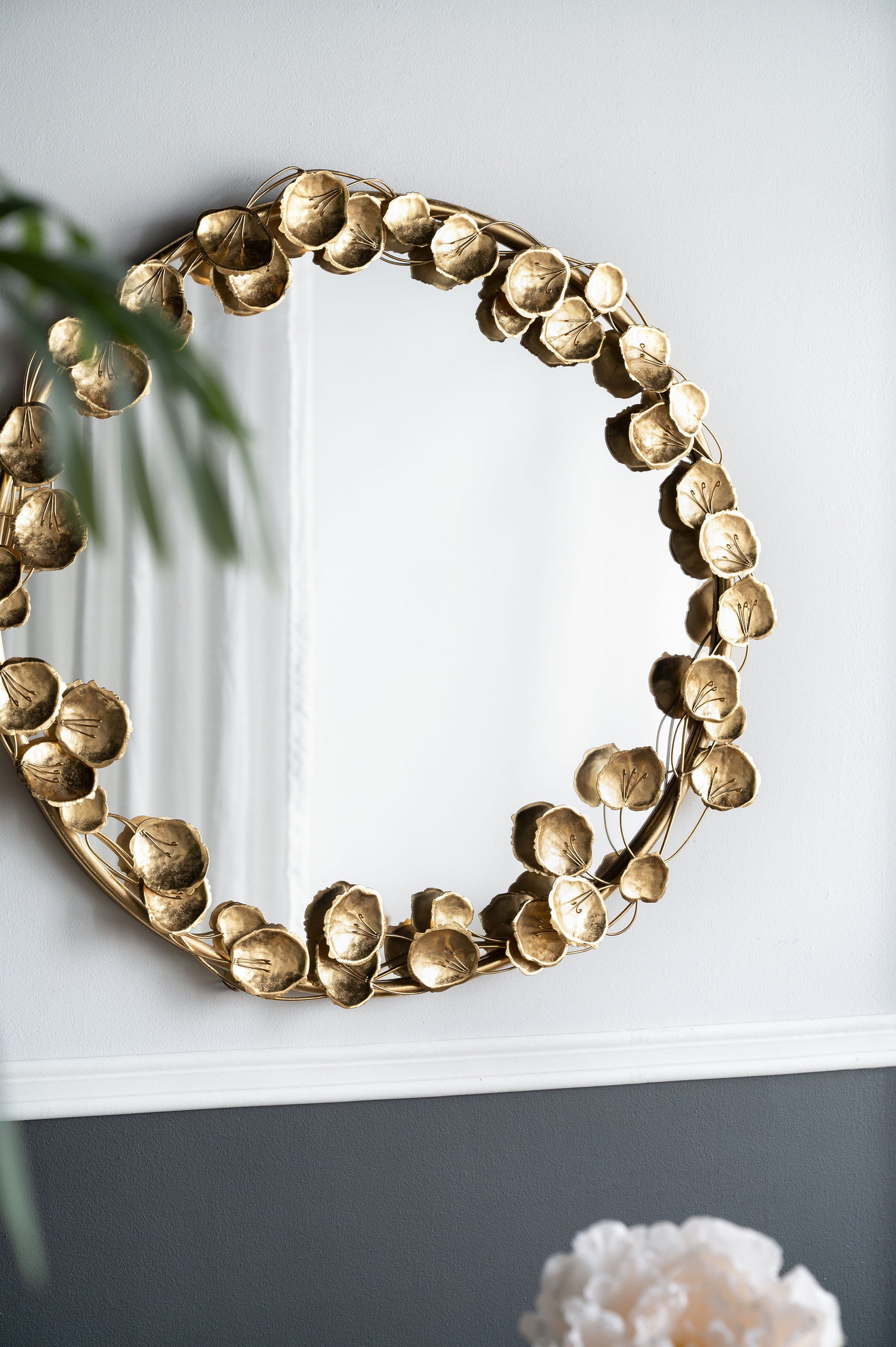 Round Metal Wall Mirror With en Leaf Accents, Modern Decor Mirror For Living Room Entryway Hallway - Gold