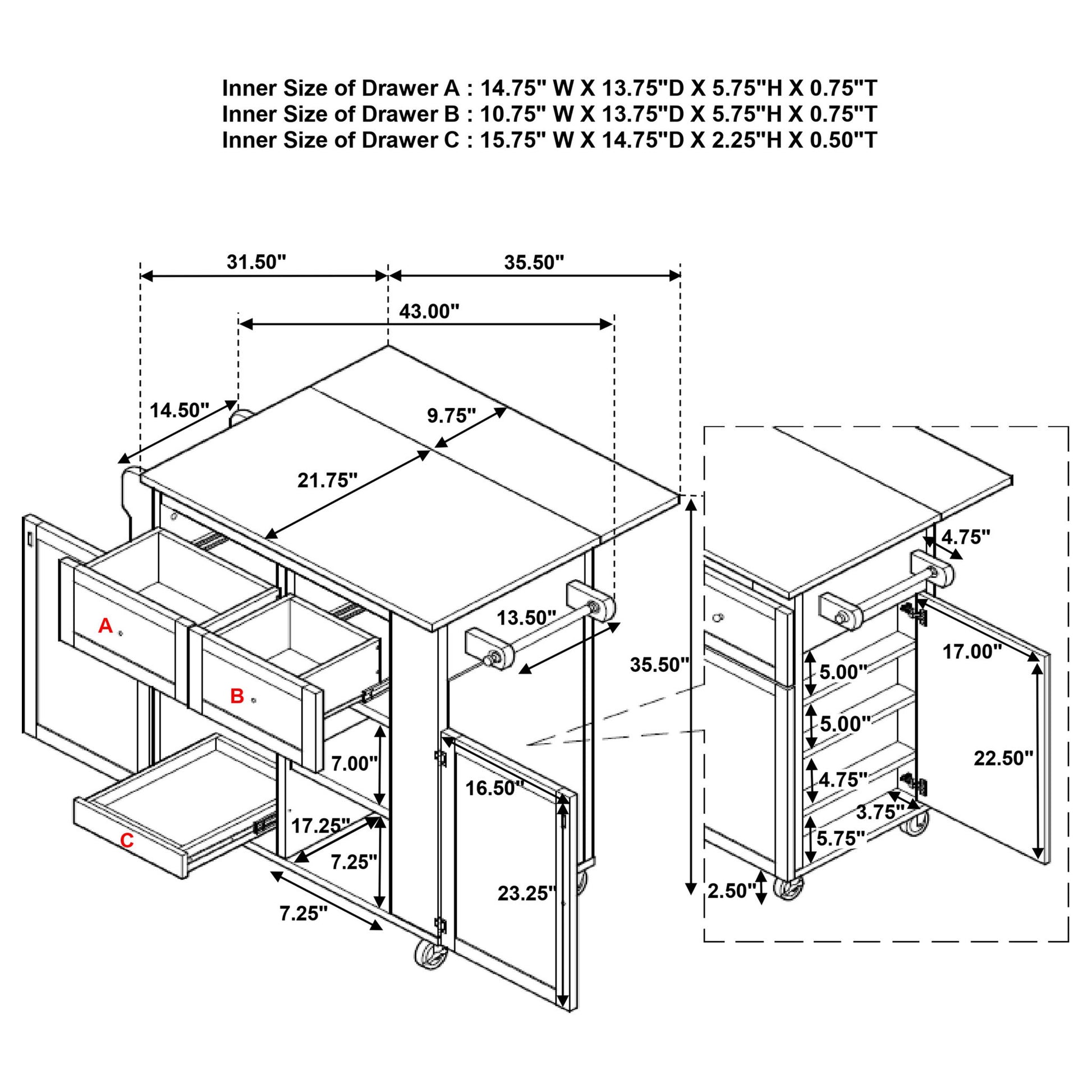 - Two Upper Drawers: Organizes small kitchen tools and supplies within reach