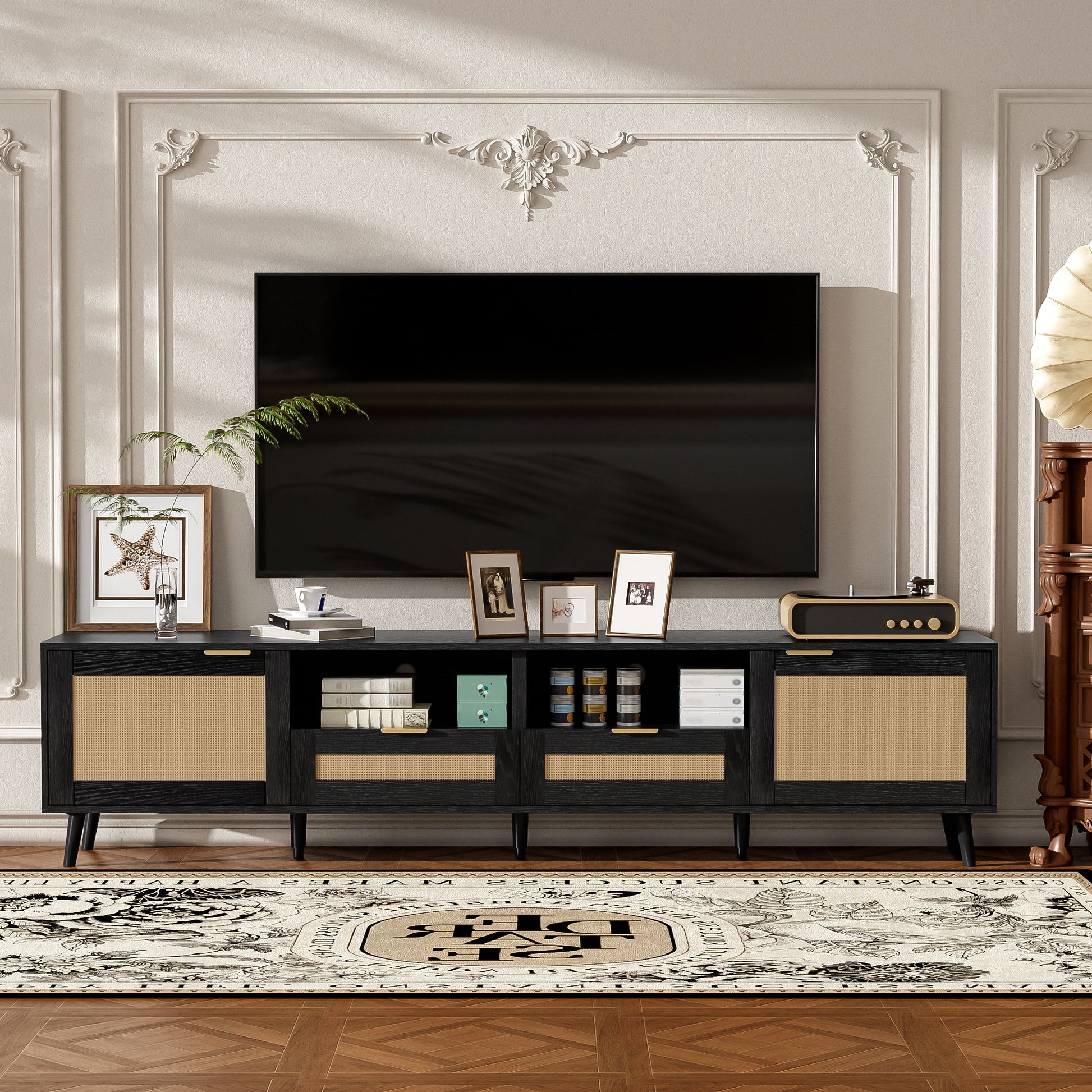 - Ample Storage Space: Includes two enclosed cabinets and two open shelves for organizing electronics, media, and decor items.
