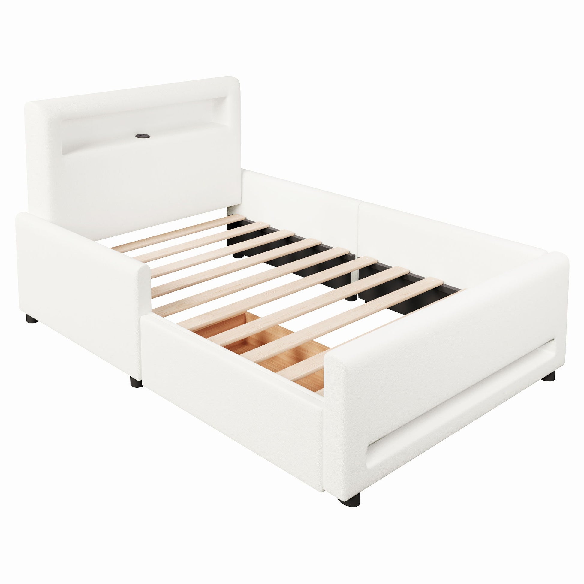 Twin Platform Upholstered Bed With Drawer, LED Light Strip, USB Port - White