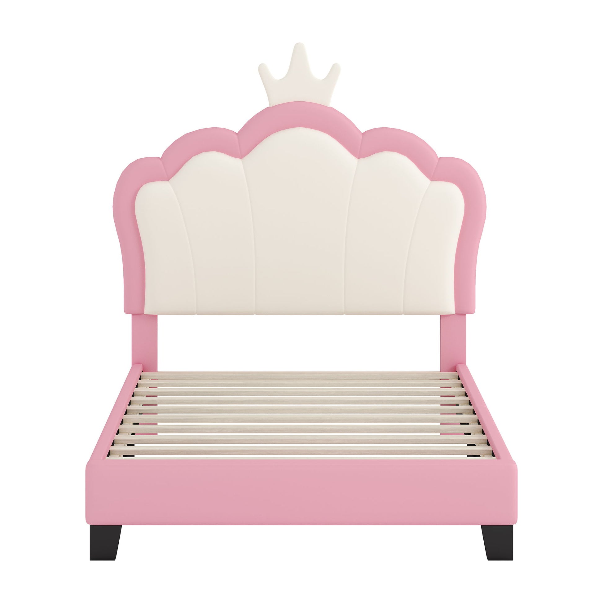 Twin Size Upholstered Princess Bed & Crown Headboard, Twin Size Platform Bed With Headboard And Footboard - White / Pink