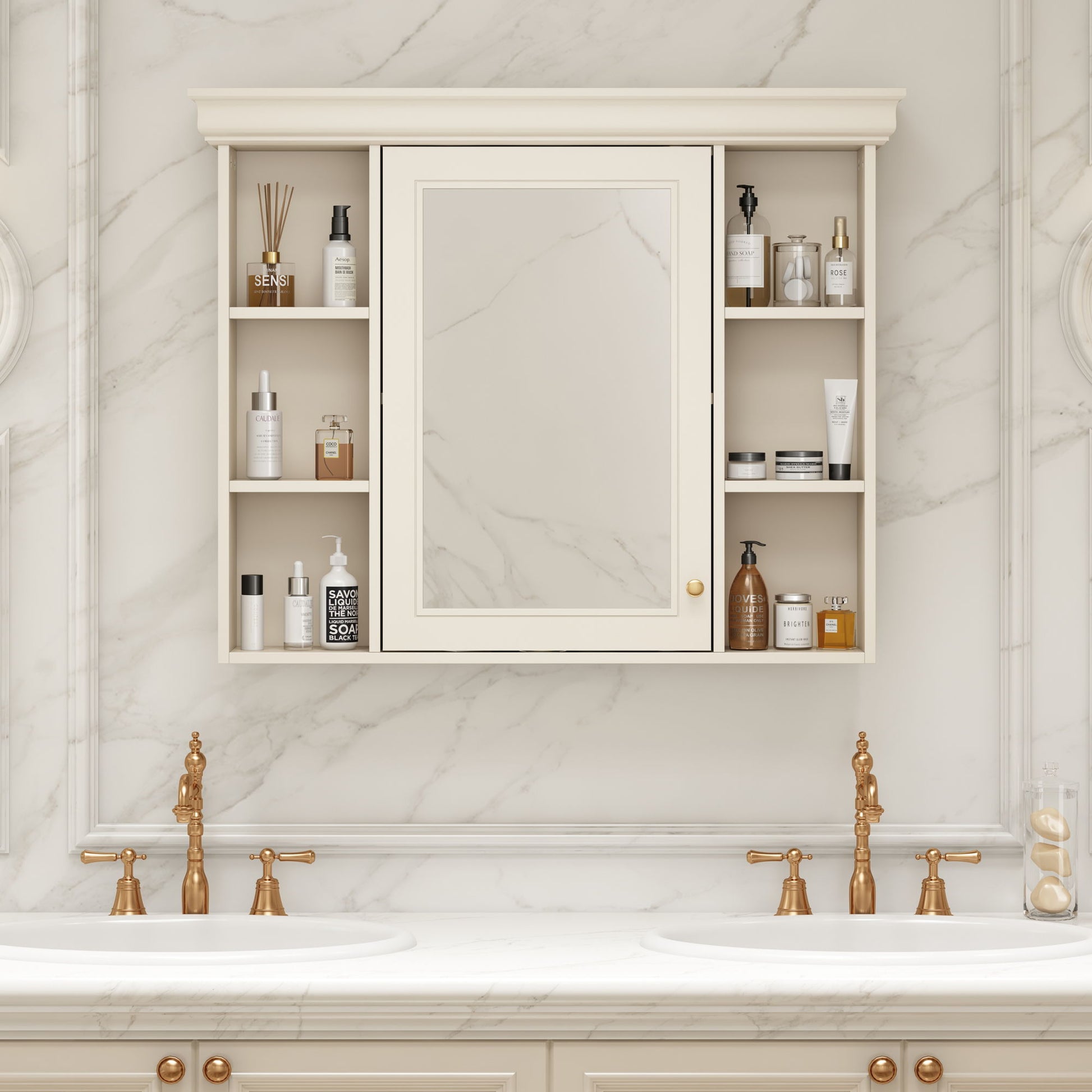 Wall Mounted Bathroom Storage Cabinet With Mirror Door - Beige / Cream